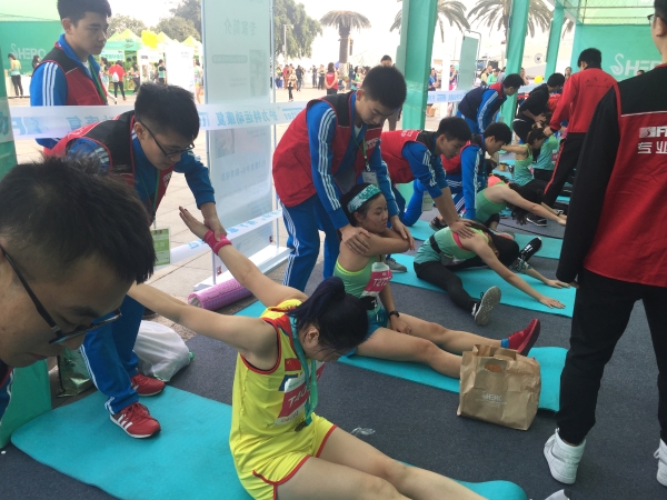 11月5日,bat365中文官方网站运动康复系护力特防护班与2015级、2016级部分共47名师生,凌晨6点从学校出发,参与2017重庆国际女子马拉松为一万多名参赛的运动员进行赛事防护工作。本次服务是与校企合作的企业重庆百会体育文化有限公司一起完成,主要从事肌贴贴扎、冰敷、赛后运动牵拉等工作。