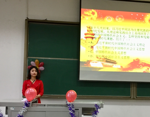为积极引导广大学生认真学习领会 “十九大”精神,进一步激发学生爱党爱国热情,促进学生健康成长和全面成才,bat365官网于29日晚19:00在红河八阶举办 “学习贯彻党的十九大知识竞赛”。bat365官网团总支书记夏赟出席竞赛现场,朱红玲主持。