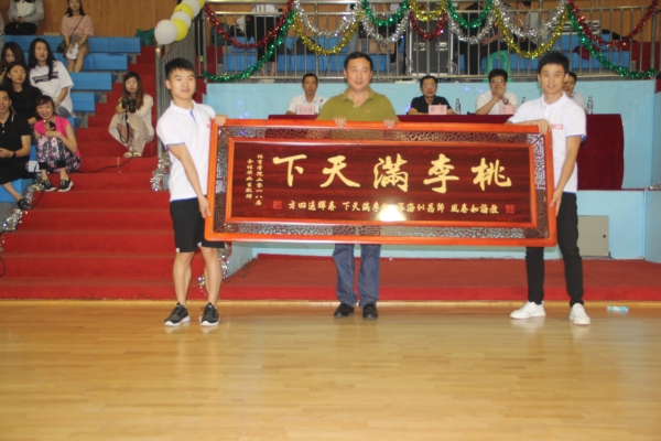 展演在学生热烈的拉歌活动中拉开帷幕,唐建忠院长代表学院党政致词,他讲到:“感谢同学们在校期间为学校学院发展所作出的贡献、祝贺同学们在大学期间实现自己的目标和理想、希望同学们不忘文理情常回校看看”。然后,毕业生李鹏和刘强代表全体毕业生为学院赠匾:“桃李满天下”,唐建忠院长代表学院受匾。