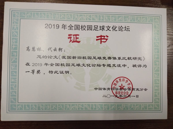 bat365官网高慧林副教授与2017级体育教育3班代云轲同学应邀参会。大会共评选出359篇论文入选论文集,其中30篇作为专题报告。6月1日下午高慧林副教授就“我国新旧校园足球竞赛体系比较研究”论文做了会议专题报告并获得了一等奖,得到了参会专家学者的一致好评。此次参会,扩大了bat365官网的国内知名度,是学院领导长期重视学科建设的结果,也进一步推动了bat365官网学科建设的可持续发展。