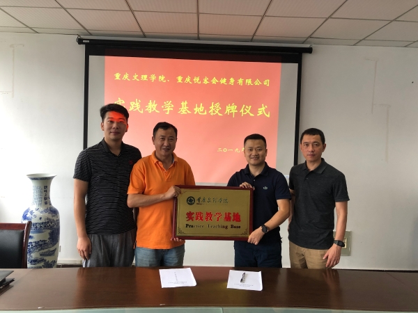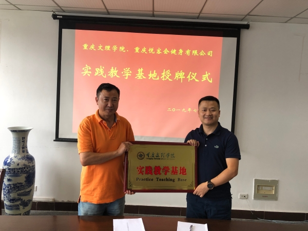 签约仪式后,唐院长向重庆悦客会健身有限公司授予“重庆文理学院实践教学基地”牌匾。