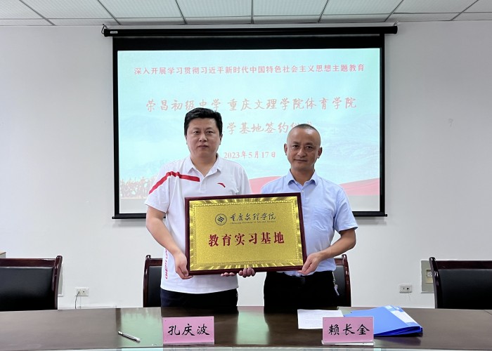 2023年5月17日,bat365中文官方网站与荣昌初级中学在知津楼C502举行了实践教学基地签约仪式。bat365中文官方网站党总支书记孔庆波、教学副院长王勇、体育教育系主任钟利与荣昌初级中学副校长赖长金、荣昌区体育教研员李建祥等出席了签约仪式。