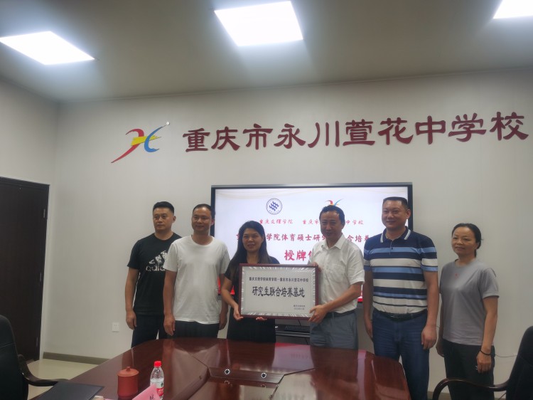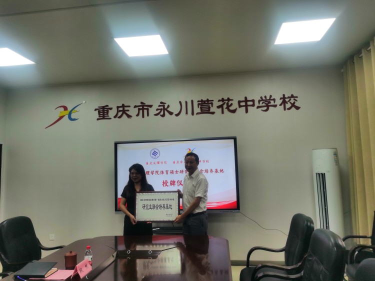 6月29日上午,bat365官网体育硕士研究生联合培养基地授牌仪式在永川萱花中学举行。bat365中文官方网站党总支副书记、院长唐建忠,永川萱花中学党委书记、校长龙远琴,副校长段然,姜帅及体育组相关教师出席授牌仪式。授牌仪式由萱花中学副校长段然主持。