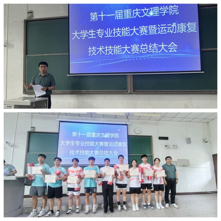 在总结大会上,邱国荣主任系统梳理了赛事筹备、开展全过程,回顾了选手们的赛场拼搏风采,并总结了宝贵经验与收获。冠军团队进行了运动康复技术实操演示。他们凭借精湛的技艺和默契的配合,生动展现了专业要点,其专业风采赢得了现场师生的阵阵掌声。教师代表刘凌从指导教师的视角对比赛团队进行点评和剖析。既肯定了优点,也指出了可提升之处。总结会后与会领导和教师为获得一、二、三等奖的团队进行了颁奖,激励同学们以获奖团队为榜样,努力学习,不断提升专业水平和能力。余继军在总结讲话中,对此次学生专业技能大赛的举办表示充分肯定,鼓励同学们持续钻研、刻苦训练,期待运动康复系学子在全国比赛中再创佳绩。