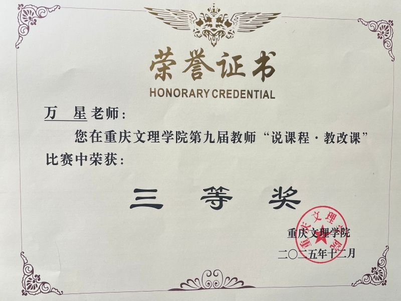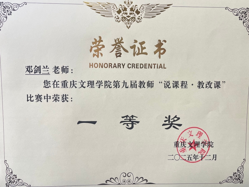 近日,重庆文理学院第九届教师 “说课程・教改课” 比赛暨教学创新比赛获奖名单正式公布,bat365中文官方网站教师凭借扎实的教学功底、创新的教学理念与出色的现场展示,在激烈角逐中脱颖而出,邓剑兰、万星两位教师分别荣获重要奖项,为学院赢得了荣誉。