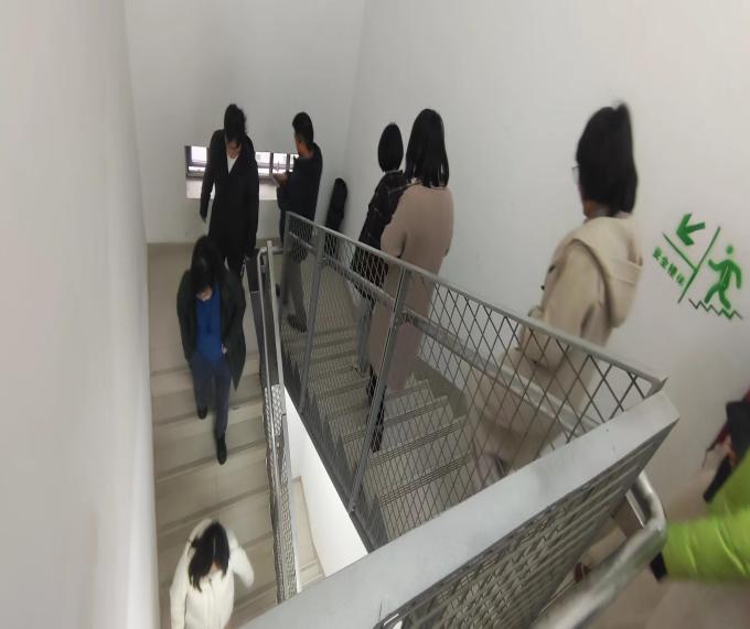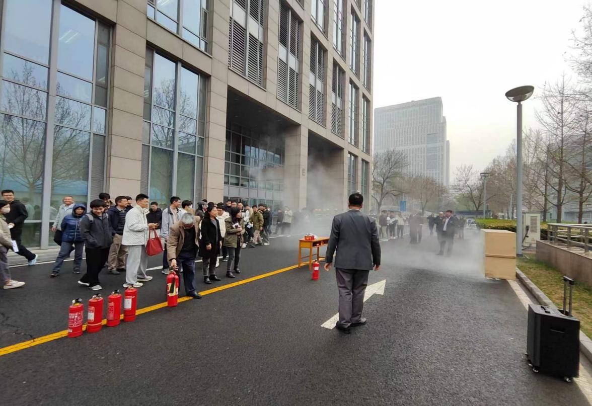 随着紧急疏散警报的拉响,楼内的学院师生在物业人员的指引下快速从安全通道逃生,迅速到达新主楼E座西门外的疏散集合点,顺利完成应急疏散环节。整个疏散过程紧张而有序,所有师生均撤离到了指定位置,未发生任何混乱和意外,达到了预期效果。