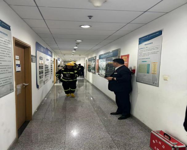下午4时整,新主楼E804房间模拟发生火情,新主楼物业中控室的消防主机突然接收到了E座8层的手动报警按钮的报警信号,中控室马上通知距离最近的巡视人员跑点核实,发现E座8层804房间烟雾较大,巡视员立即向中控室报告请求微型消防站支援,中控室通知微型消防站出动进行模拟初期火灾扑救,并模拟拨打“119”报警。鉴于火势蔓延较快,为保障楼内人员的安全,决定对E座1至11层的全部人员进行紧急疏散。