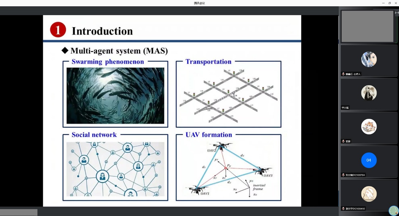 接下来进行分享的是开云kaiyun体育2018级博士生张璟尧同学。他以“非线性多智能体网络系统在切换拓扑下的分布式迭代学习控制”为题,整合其发表在AUTOMATICA和IEEE TAC上的两篇论文研究内容进行汇报。张璟尧同学首先简要介绍了迭代学习控制的基本原理与优缺点,并以行进乐队为例,对迭代学习控制的对象——多智能体系统的相关特点与控制目标进行了阐述。随后引入代数图论、联合生成树等知识,设计分布式迭代学习控制协议,将全局Lipschitz条件放松为局部Lipschitz条件,通过理论推导、数值仿真等手段,回答了在具有切换拓扑的非线性多智能体网络系统中如何实现分布式迭代学习控制这一问题。