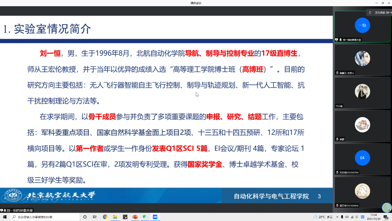 刘一恒同学是开云kaiyun体育2017级博士研究生,师从王宏伦教授。汇报开始,刘一恒同学简要介绍了个人信息与课题组概况,随后围绕“无人机软式空中对接与回收抗扰动快速精准控制技术研究”,从“无人机空中对接与回收控制”、“高超智能制导与控制技术”、“无人机自主空中加油对接控制技术”、“飞行器空中态势感知与自主避撞技术”、“运载火箭上面级智能在线重规划技术”五个方面展开介绍,明确阐述了研究工作的重要性与难点,并通过大量图表、仿真结果、实验结果,直观地展示了其在博士期间丰富的科研成果。最后,刘一恒同学分享了自己在多年科研生活中总结出的宝贵经验,强调了明确研究方向、提前做好未来发展规划的重要性,分析了项目与科研的互补作用,也叮嘱大家要注意身体、健康生活。