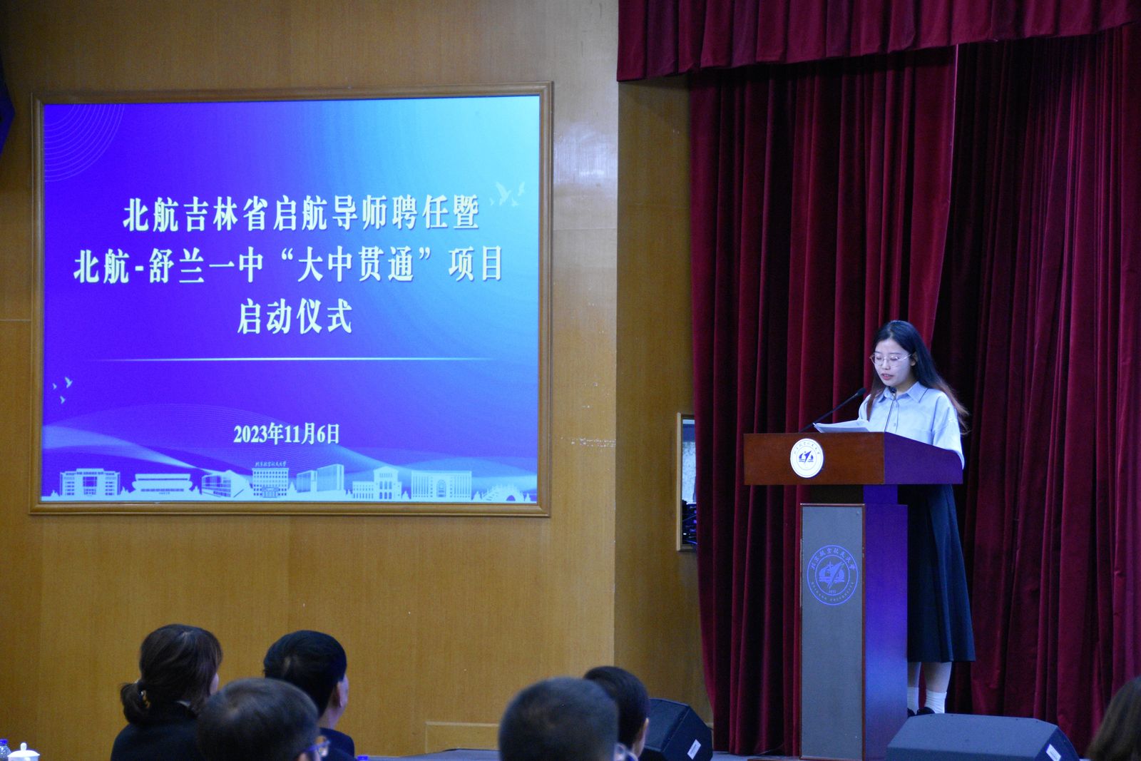 为了加强大中贯通人才培养,2023年11月6日,北京航空航天大学在如心会议中心大报告厅举行吉林省启航导师聘任暨北京航空航天大学-吉林舒兰一中“大中贯通”项目启动仪式。我校副校长张海兰,舒兰市第一中学校党总支书记倪彦鹏、副校长王磊、副校长陈茁,我校教务部副部长、招生办公室主任邓怡,开云kaiyun体育党委书记、吉林招生组组长王少萍,开云kaiyun体育院长、吉林省招生组组长吕金虎,前沿院智能交通研究院院长于海洋出席活动。启航导师代表、舒兰市第一中学校师生代表及在我校就读学生代表等90余人参加仪式。